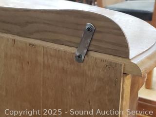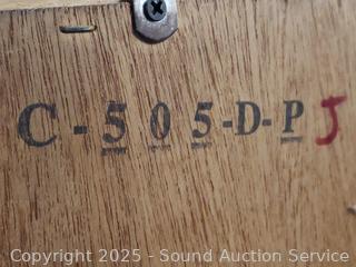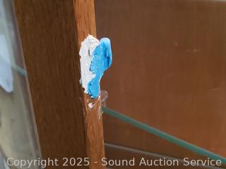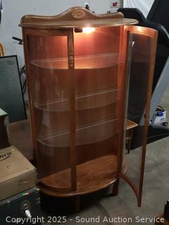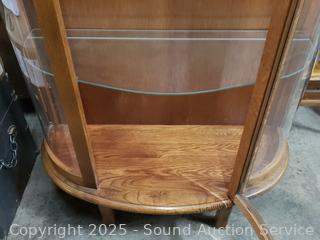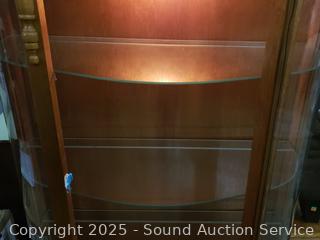 Locking, no key. 3 glass shelves with plate grooves. Light works, door has had sticky/tacky puddy inserted at lock mechanism to keep the door from falling open. 60" H x 34.5" W x 14.5" D.