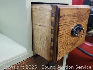 29" H x 38.5" x 17.75" D. Don't see any major issues. All wood construction, dovetail joinery.
