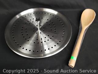 Comes with 1 wooden utensil, silicone trivet, splatter screen, steamer insert, lid. Appears unused, in excellent condition.