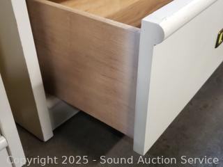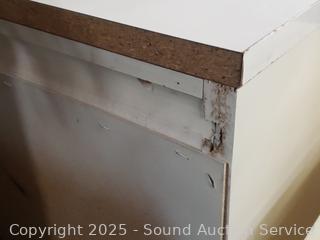 Particleboard construction, dovetail joinery, laminate finish. Some minor scuffs. Approx. 30" H x 30" W x 17.75" D. Matches the previous & next few lots.