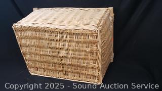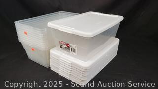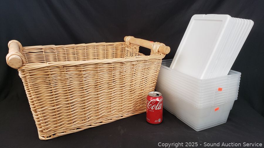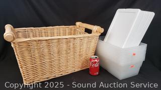 Lot #0036: Woven Basket & 10 Small Storage Totes w/Lids
