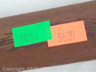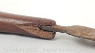 Smaller ones handle is loose, has a broken piece on handle where tang enters. 8.5" blade, 12" overall length & 12.5" blade, 16.5" length overall.