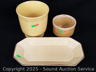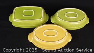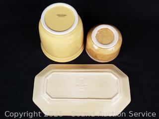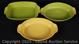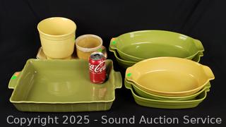 10" to 14" casserole/baking dishes. Most have some embossed numbers on the underside, yellow pot marked Smith & Hawken, Calif Pottery bowl & Pfaltzgraff elongated dish (some crazing). Refer to photos for more details.