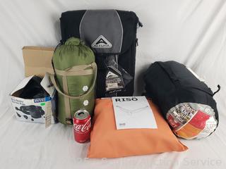 2 Light sleeping bags, hammock, electric air pump, urban briefcase.