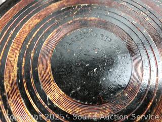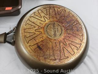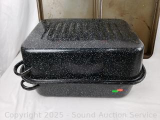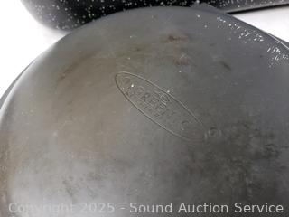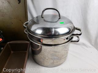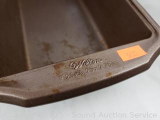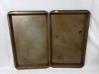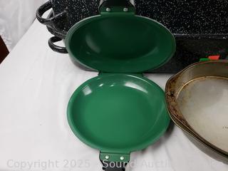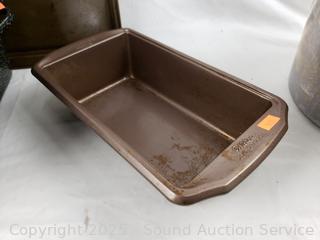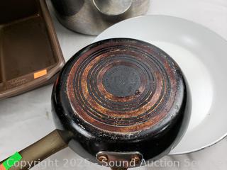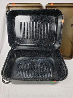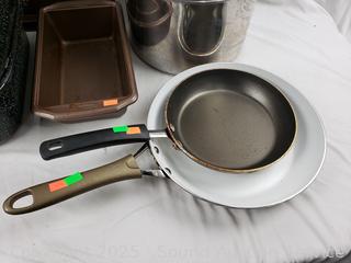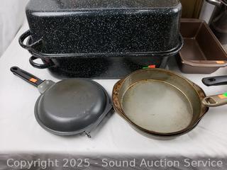 Baking sheets, roasting pan, stainless boiling pot, loaf pan, skillets. various wear from use.