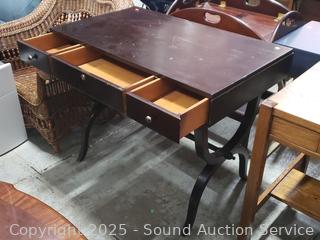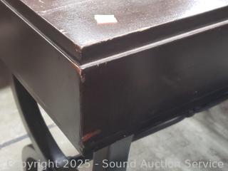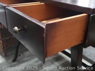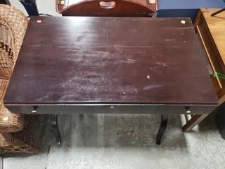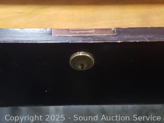 Center drawer is locking, no key. 31.5" H x 39.5" W x 23.5" D. Some scuffs, wear to finish.