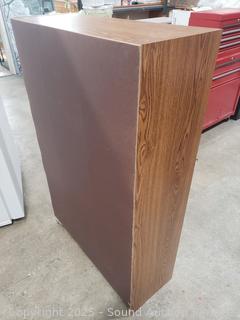 Particle Board Construction, wood grain finish. Adjustable shelves. Don't see any major issues.
