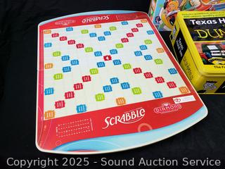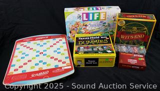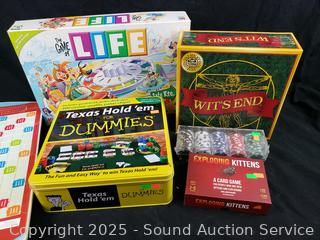 Diamond Anniversary Edition Scrabble. Exploding Kittens, The Game of Life, Wits End, Texas Hold'em for Dummies & Poker Chips set. Unknown completeness. Refer to photos for more details.