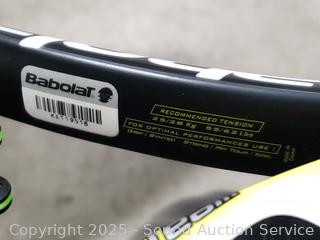 Wilson Triumph Racquet (some scuffs, scratches), Babolat Aero Pro Tech Racquet 9.9oz, 100sq.in. (some scuffs, wear to finish). Refer to photos for lot contents, more details.