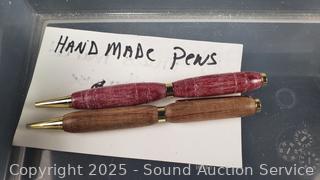 Believed they were used to make handmade pens, comes with a small tote with 2 pens, and a piece of paper stating handmade, 1 with Gatsby twist pen hardware, one with other pen hardware. Approx. 5" to 6" length, 3/4" blanks. Various types of wood, bloodwood, Coco Boco, African Blackwood, Texas Flag, Pink Tigress Oak, Yellow Heart, Black Palm, Purple Heart, Rosewood, some composite materials, etc. Refer to photos for more details, I am not a wood expert. 3" x 10.5" x 6", 6.25" x 10.5" x 14" & 3.25" x 10.5" x 14" totes with lids.