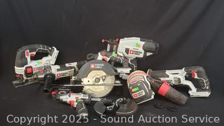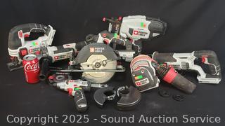 Untested. No batteries, comes with a charger. Signs of wear from use. PCC842L Impact Screwdriver, PCC790 18GA Nailer, PCC761 4.5" Angle Grinder, PCC650 Scroll Saw, PCC670 Reciprocating Saw, PCCW205 5" Random Orbit Palm Sander, PCC660 Circular Saw.