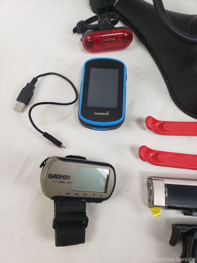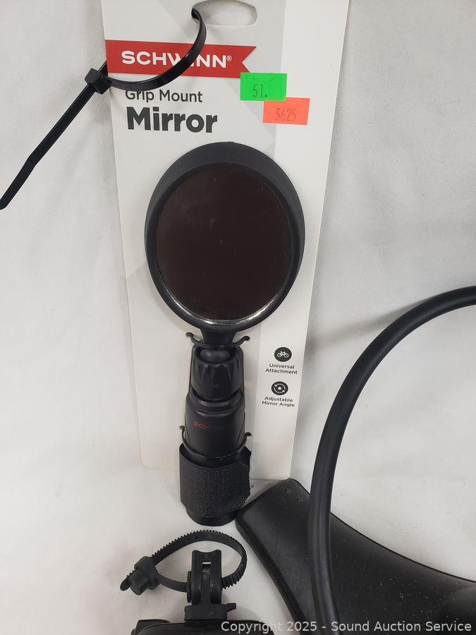 Schwinn grip mount mirror, Blackburn bicycle pump, Garmin, several lights & bar mount bag.