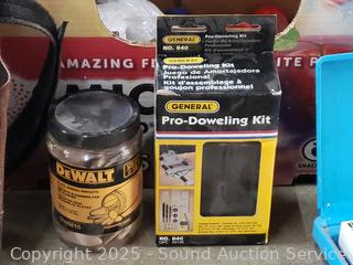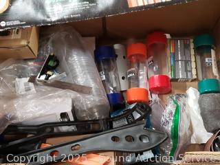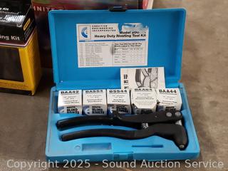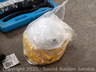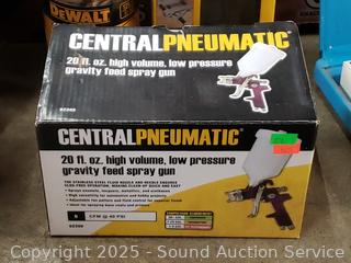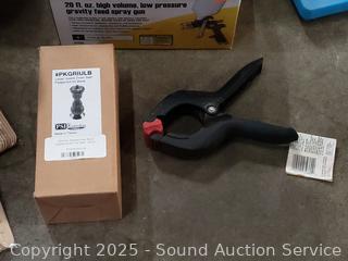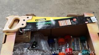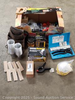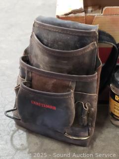 Craftsman leather tool bag, rivet gun w/rivets, 20" crosscut saw, CP HVLP paint spray gun, doweling kit, plate joint biscuits, etc. Refer to photos for lot contents, more details.