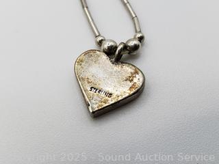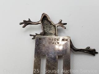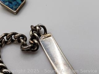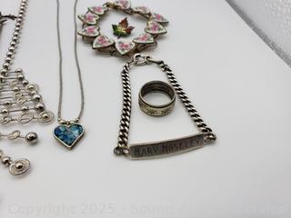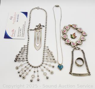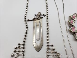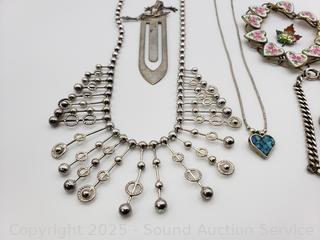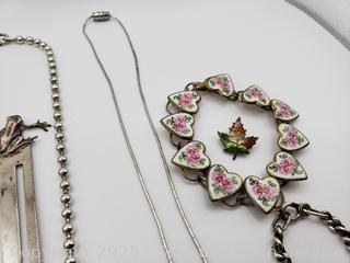 800 Silver necklace, engraved bracelet, stone inlay pendant, ring S:5.5, frog bookmark, enamel bracelet, sterling beaded necklace, maple leaf pin. All marked sterling, all tested silver. TW: 67.91g.
