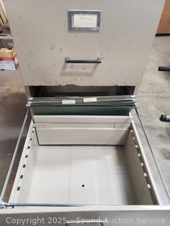 File dividers in the drawer. Some hanging file folders. 52" H x 18" W x 25" D.