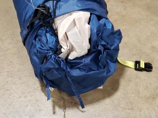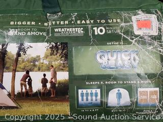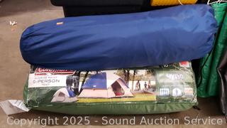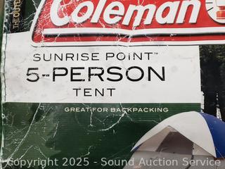 Coleman 5-Person Tent has light wear, don't see any issues to tent/cover, Stakes are bent out of shape. Tarps have wear from use. Other tent Appears complete, light wear from use, Approx. 100" x 80" x 56". Tote 20" H x 37" x 21".