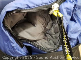 North Face bag some dirty spots. Coleman Military green & Exxel Blue sleeping bags. All approx. 33" x 75".