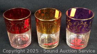 6 Cordials, 6 Oyster Cocktail, 3 Juice Glasses Painted in Gold. 1 cordial base is chipped.