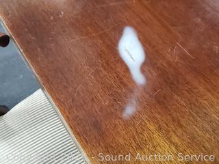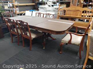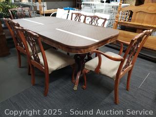 Comes with tabletop protector & 2 15" leaves. Various scuffs, wear to finish from age, use. Some veneer damage on a few of the splatbacks of the chairs. Chairs are also claw foot. One of the legs of table has been repaired screws were stripped, glued into place, can't even tell now. Approx. 29.5" H x 65.5" x 44" table. Refer to photos for more details.
