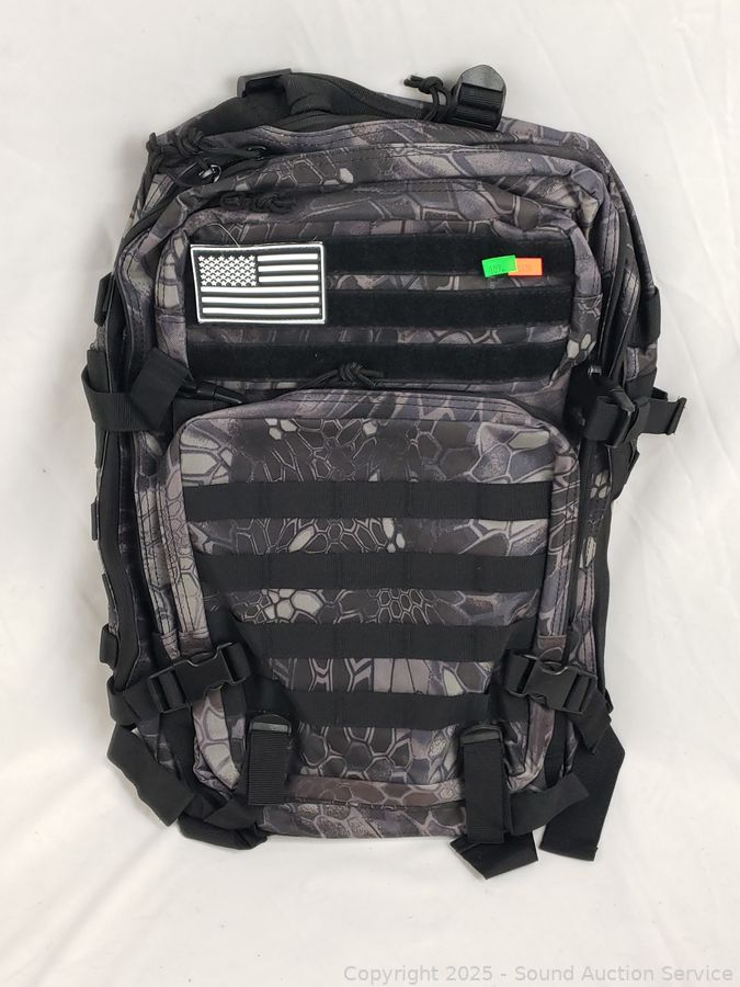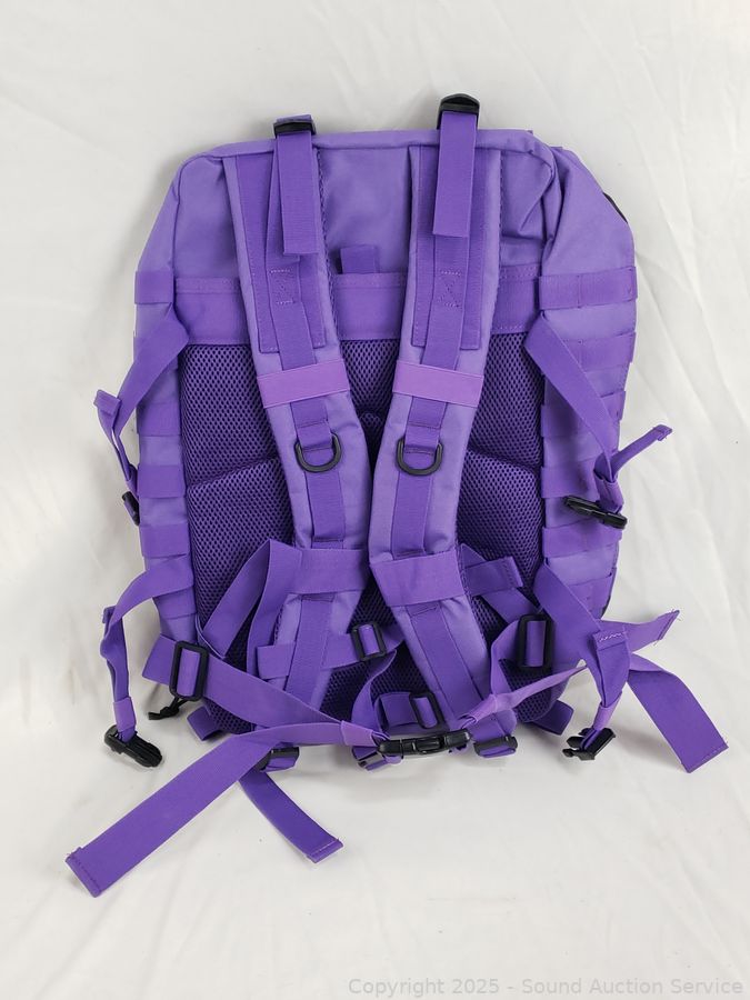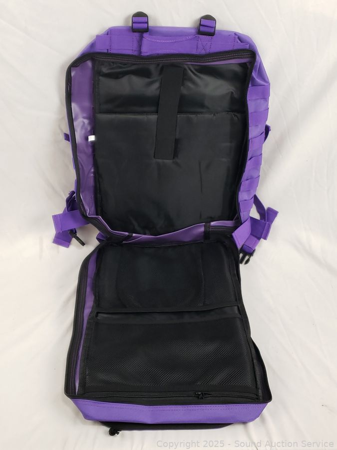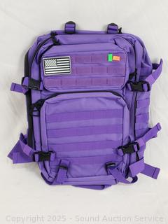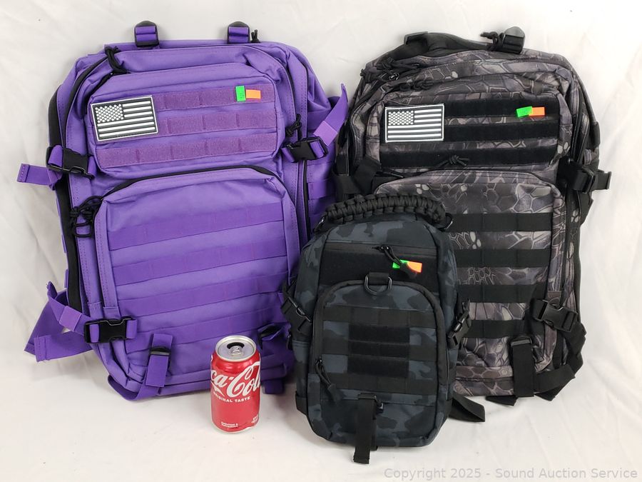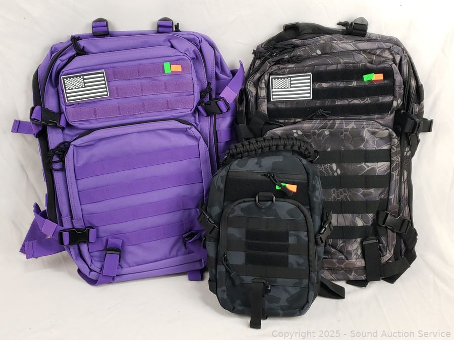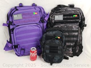 Lot #0189: 3 Purple/Gray/Black Tactical Backpacks, Shoulder Bag