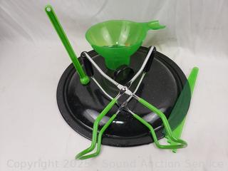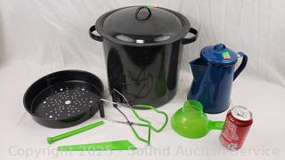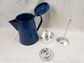 Lot #0224: Enamelware Percolator Coffee Pot, Boiling Pot w/Jar Tongs, Steam Insert