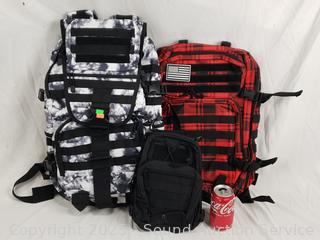Lot #0187: 3pc White Black & Red Tactical Backpacks, Shoulder Bag