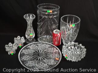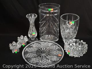 Vases (one is Waterford), candleholders, ashtray, charger. Do see several pieces with chips.