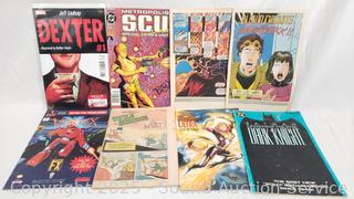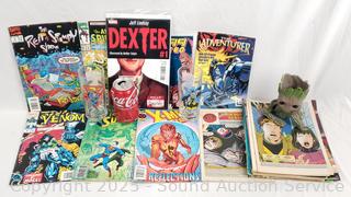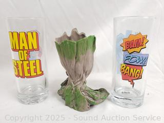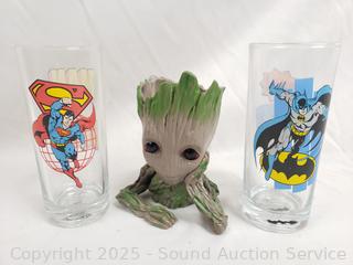 Lot #0259: Assorted Comic Books, Batman/Superman Tumbler Glasses, Groot Figure