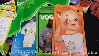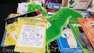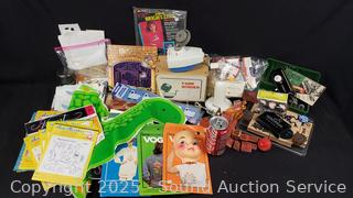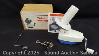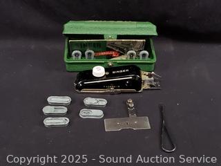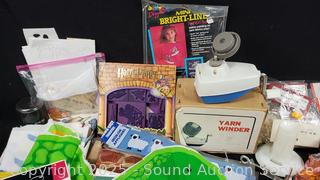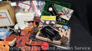 Lot #0213: Assorted Ink Stamps, Yarn Winder, Singer Buttonholer, Iron Transfers, Etc