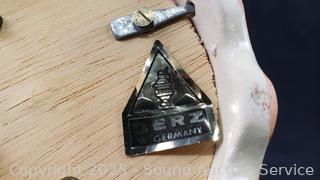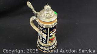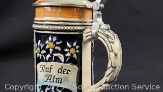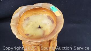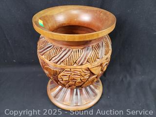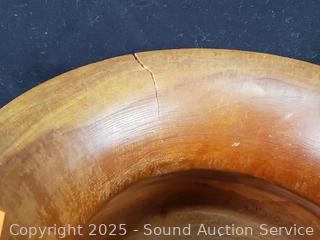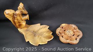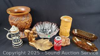 Glass console bowl, Wood Pot/vase, German stein, burnt candle, carved wood squirrel figure, etc. Refer to photos for lot contents, more details.