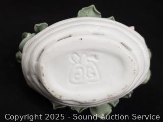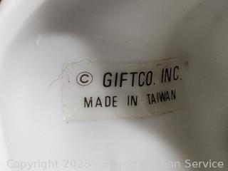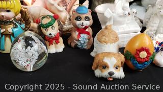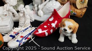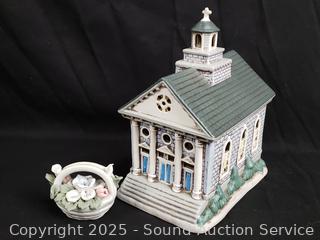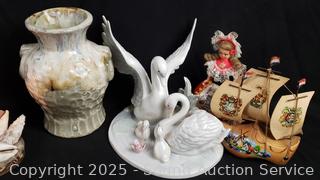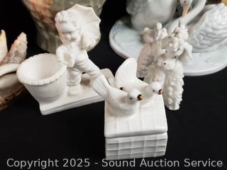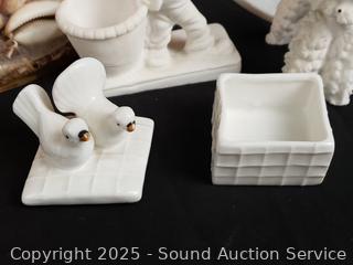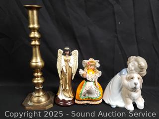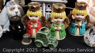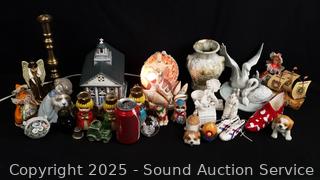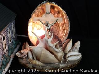 Porcelain lighted house, pottery vase, lighted shell crucifix, brass candleholder, porcelain figure, etc.