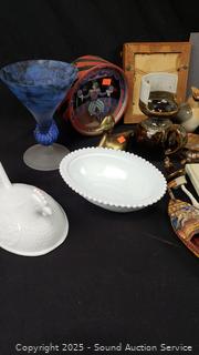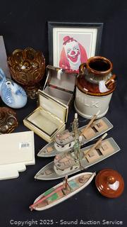 Milk glass hen on nest, thumbprint marigold compote, wood model ships, brown drip milk jug, musical bank, wall decor & more. Refer to photos for lot contents, more details.