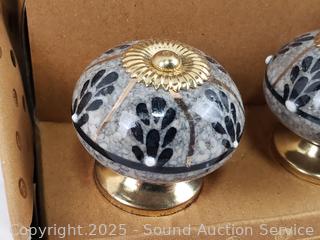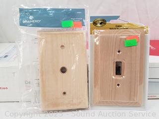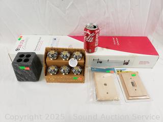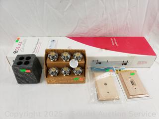 Lot #0134: Decorative Drawer Knobs, Glass Shelf, Stone Toothbrush Holder & Wood Switch Covers