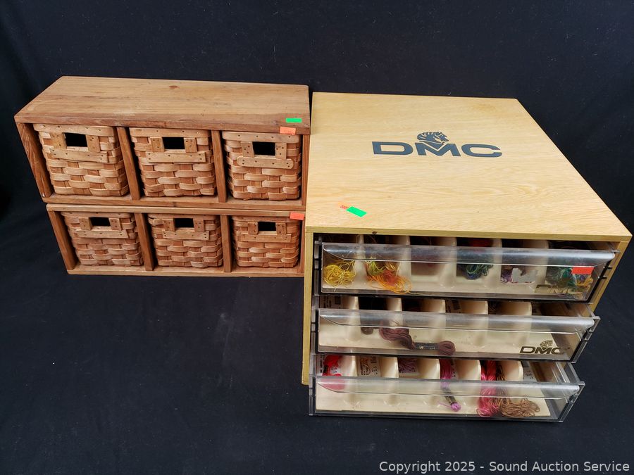 Lot #0244: Organizer Full of Assorted Thread & 2 3-Drawer Wicker & Wood Organizers