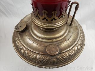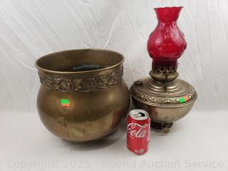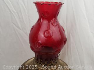 Lot #0082: Vtg. Dresden Oil Lamp w/Ruby Shade & Footed Pot
