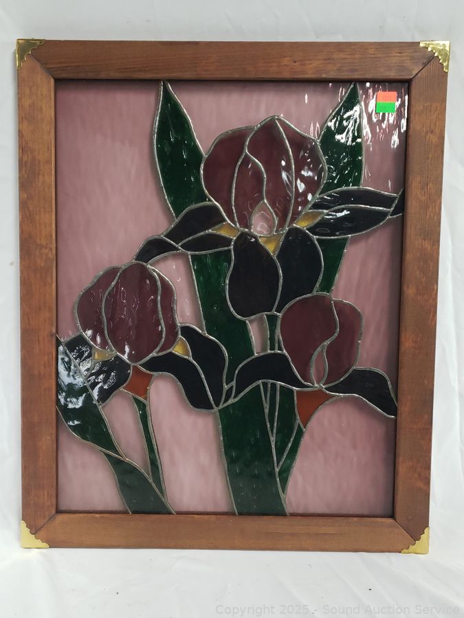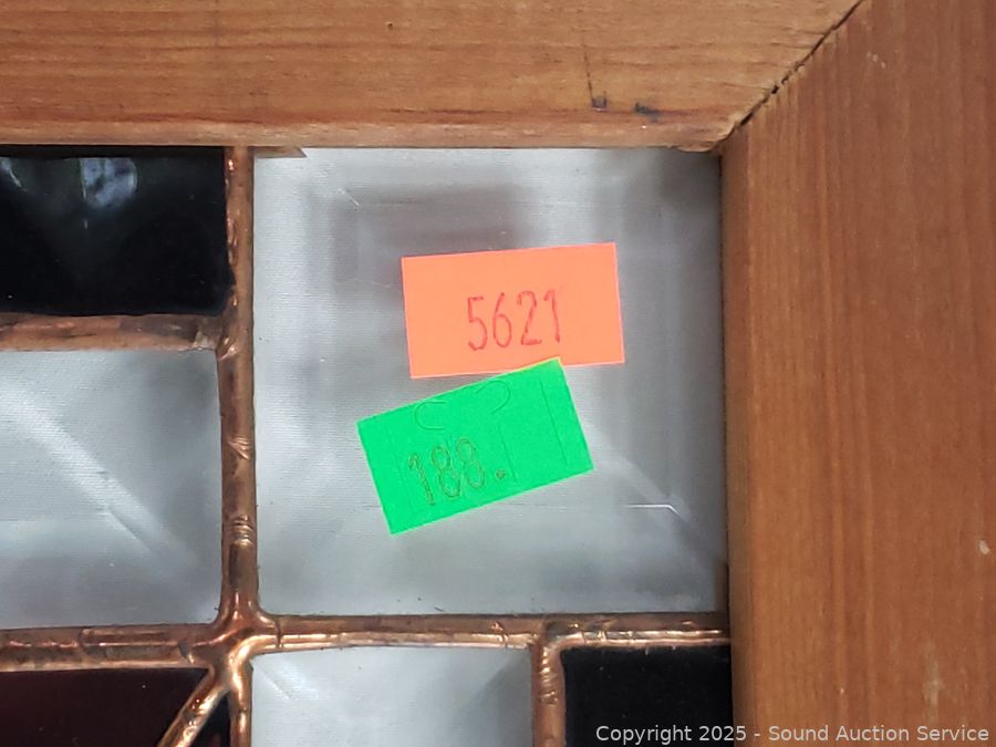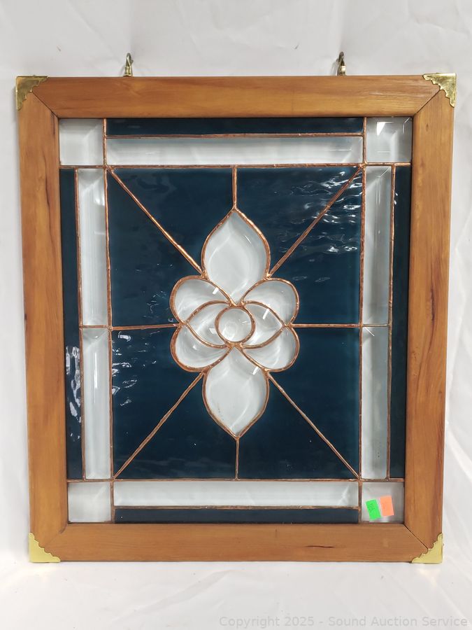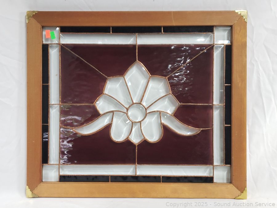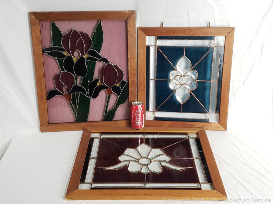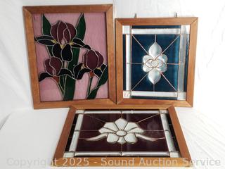 Lot #0188: 3pc Stained Glass Wood Framed Window Decor