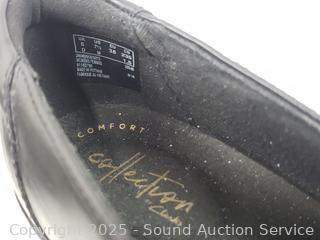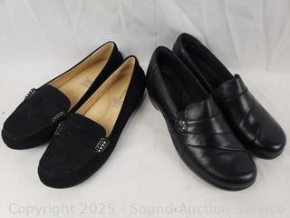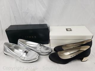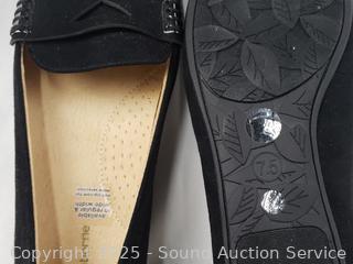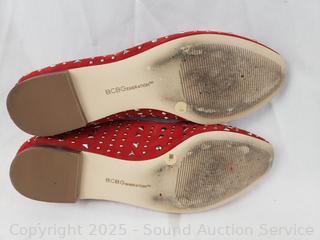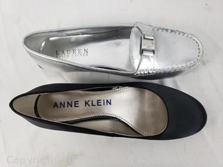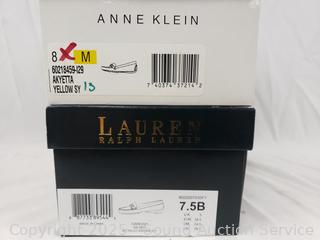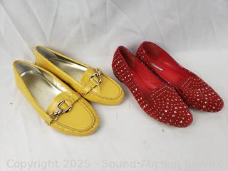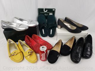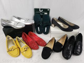 Anne Klein Yellow Snakeskin Loafers S:8, Lauren Ashley Green Plush Loafers S:M, BCB Generation Red S:8M, Black Collection Club S:7.5, Liz Claiborne S:7.5, Anne Klein S:8, Ralph Lauren S:7.5. Signs of wear, all in good condition.