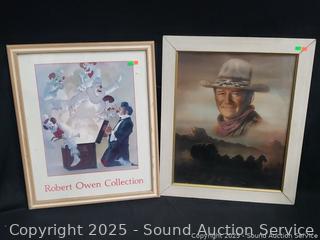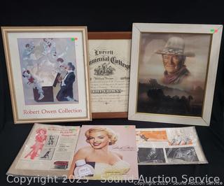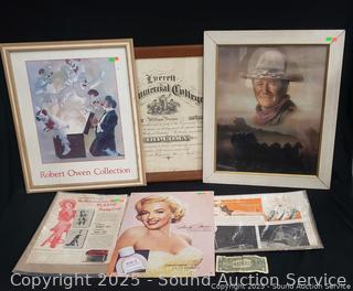 Lot #0025: Advertising Ephemera, John Wayne Print, Antique Diploma