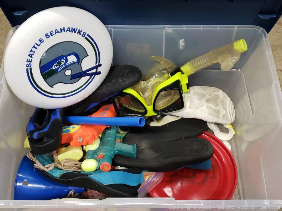 Water socks, squirt guns, masks, snorkels, fins, football, frisbee, etc.