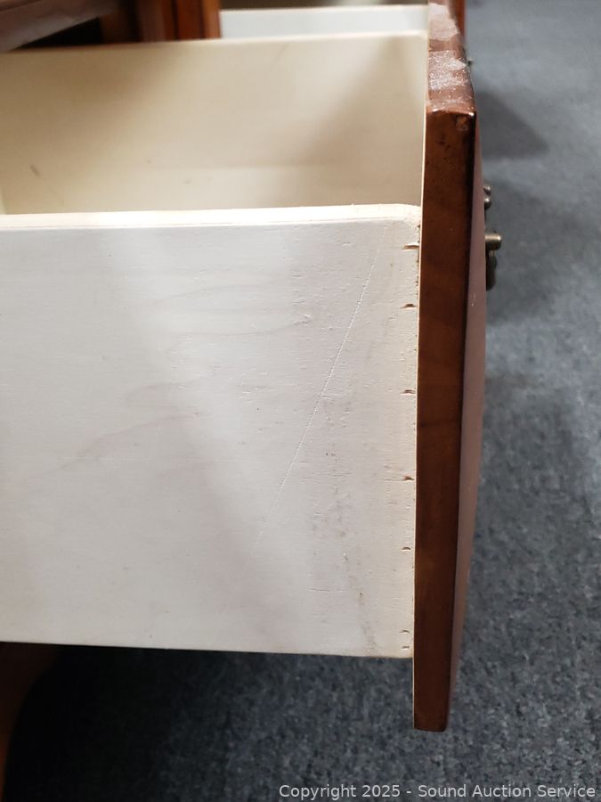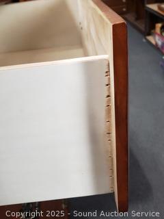 Particleboard construction, wood veneer, fronts. Made in Vietnam. Some light scuffs, wear to finish. Matches the next lot. 51.5" H x 38" W x 18" dresser, 24.5" H x 26" W x 16.25" D.