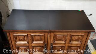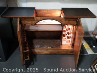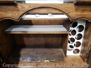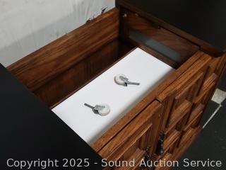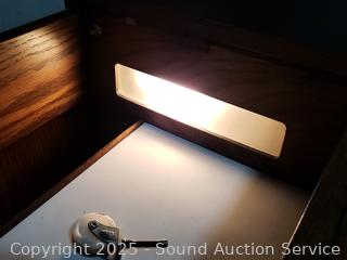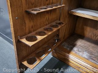 Laminate top and shelves. Locking, NO key. Has a mounted light inside. Approx. 32' H x 40" W x 18" D. 2 Casters not attached.
