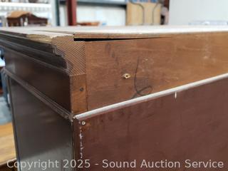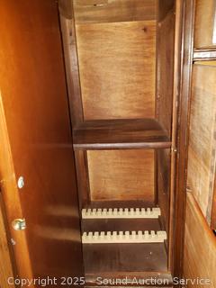 Appears to be all wood construction, dovetail joinery. 1 piece. Some scuffs, wear to finish. 73" H x 44.75" W x 16" D.