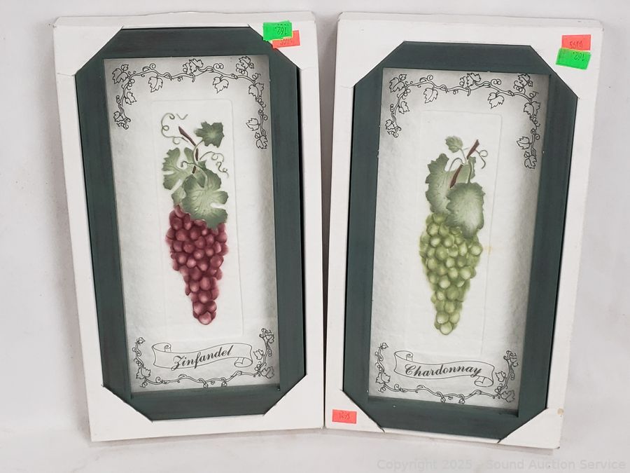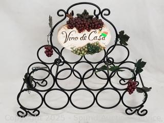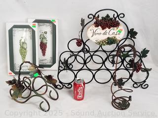 Wrought Iron Wine Bottle Rack & Single Basket, Wrought Iron Grape Vine Bottle Holder & 2pc Chardonay & Zinfandel Artwork.