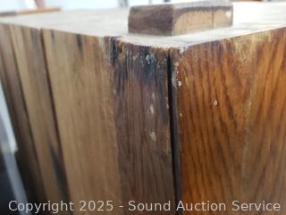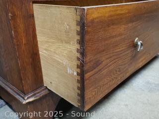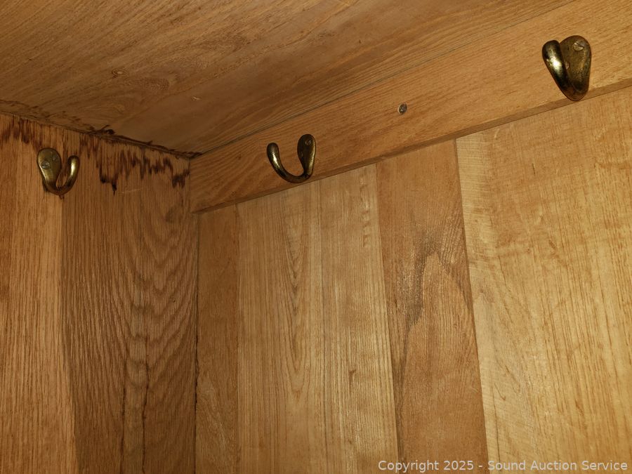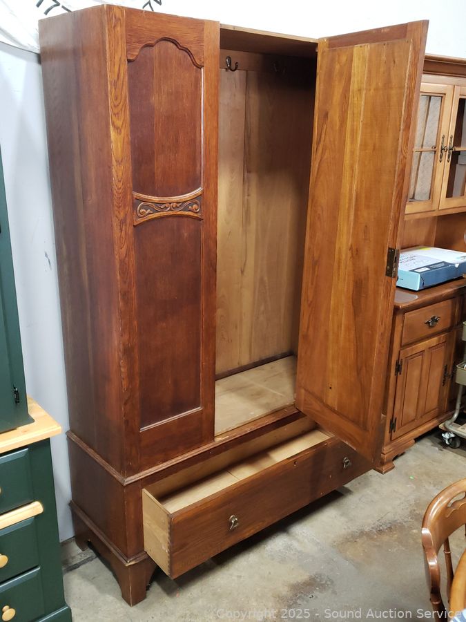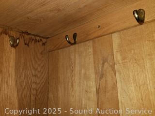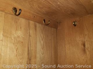 Has hooks for hanging instead of a rod. Single drawer. Approx. 72.5" H x 46" W x 15.5". Lower drawer slides in a little too far, nothing to stop it. Appears to be all wood Contruction, olde patina finish. Some scuffs, wear to finish.