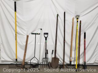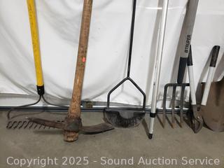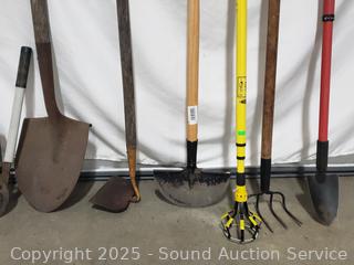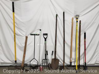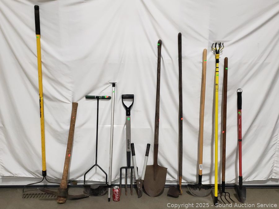Hoe cultivator, edger, spade, potato fork, brush rake, mattock, loppers garden shovel, bulb changer.