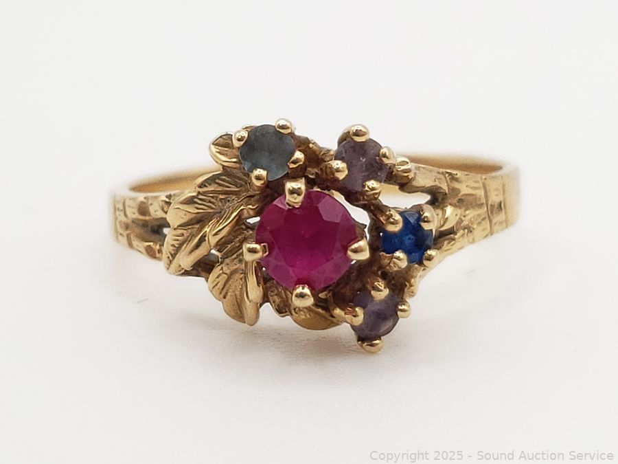 Red stone tested ruby, blue stones tested spinel & topaz. Marked 14K, held on acid test. TW:2.44g.