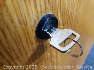 Appears to be functioning as intended. Some minor wear to finish. 29.5" H x 33.75" W x 19.5" D. Locking, comes with Key.