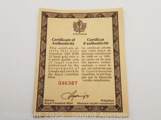 Lot #0003V: 22K .917 Gold 1981 Canada $100 Gold Coin