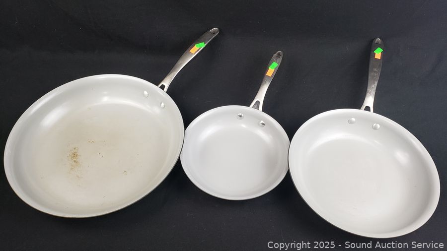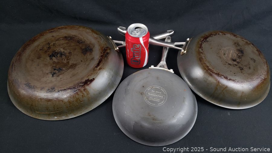 8|10|12" skillets. Signs of wear from use, heat stains, dirty spots.