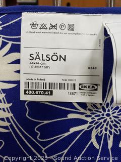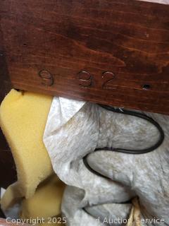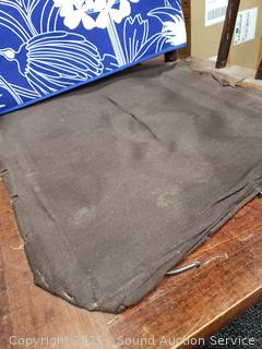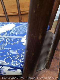 Missing original chair pads, comes with a blue seat pad. Some scuffs, wear to finish. 38" H x 25.5" W x 14.25".